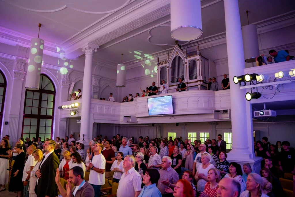 • Jeden Sonntag finden drei Gottesdienste statt, zu denen Hunderte von Menschen verschiedener Generationen zusammenkommen. Eine fröhliche Atmosphäre prägt diese Gottesdienste. Die Anbetungszeiten sind international geprägt. Neben Deutsch, Russisch und Englisch sind weitere Sprachfamilien hier zu Hause.